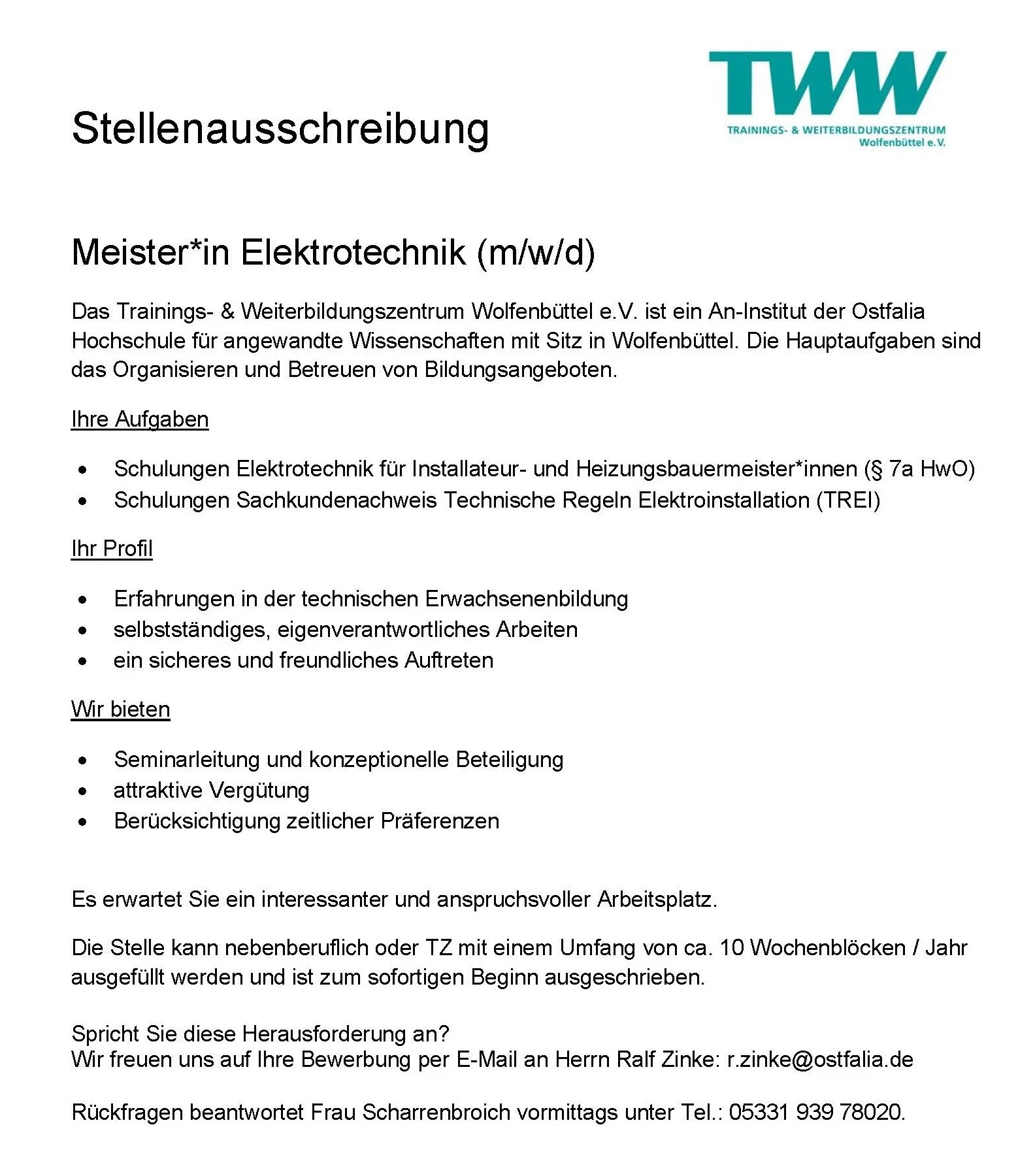 Im TWW ist das anders. Hier sind wir noch persönlich für sie da. Wir haben Namen und sind auch telefonisch für Sie erreichbar. Sie erreichen uns für die Besprechung Ihrer Bedürfnisse und Belange. Wir beraten Sie gerne und stellen uns auf Sie ein - Individuelle Beratungen ohne Verweis auf FAQs. Rufen Sie uns an oder schreiben Sie uns eine Mail - Wir freuen uns auf Sie und rufen auch zurück. Ob Masterstudiengang oder Hightech-Seminar, bei uns sind Sie richtig.
